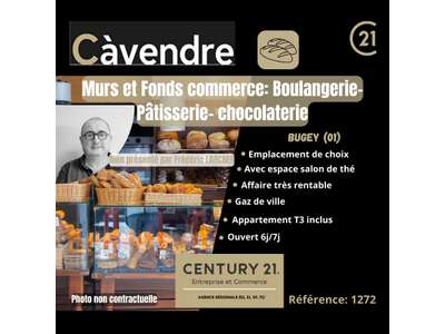 - Salon de thé dans une ville touristique du Bugey (01) Situé dans une ville très touristique du Bugey, cet établissement de boulangerie, pâtisserie, chocolaterie avec salon de thé bénéficie d'un emplacement de choix, à proximité immédiate de nombreux commerces et de nombreuses places de parking facilitant l'accès pour les clients. L'affaire exploitée depuis plusieurs années avec sérieux et passion, affiche une excellente rentabilité. Elle est ouverte 6 jours sur 7 et bénéficie d'une clientèle locale fidèle, renforcée par une fréquentation touristique régulière tout au long de l'année. Le matériel professionnel est complet, récent, de qualité et en excellent état, permettant une reprise immédiate sans investissement supplémentaire. Les espaces de travail sont fonctionnels et bien entretenus, offrant des conditions de travail idéales. Les murs commerciaux sont vendus avec le fonds de commerce, offrant ainsi un investissement solide dans une région très dynamique. Le local est raccordé au gaz de ville et comprend un appartement de type T3 à l'étage , idéal pour un couple repreneur. Les points forts :