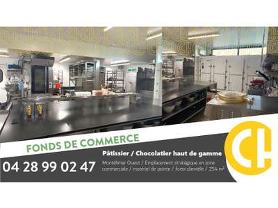À 5 min de Montélimar Ouest - Pâtisserie-Chocolaterie de référence en zone commerciale active Idéalement située sur un rond-point très passant, au coeur d'une zone commerciale en pleine expansion (enseignes de grande distribution, pharmacie, boulangerie, boucherie, restaurant, opticien, banque, concession...), cette pâtisserie-chocolaterie, leader sur son secteur depuis 2018, bénéficie d'un emplacement stratégique, d'un outil de travail haut de gamme et d'une clientèle fidèle. L'établissement se distingue par un laboratoire spacieux, lumineux et parfaitement équipé, ainsi qu'un espace de vente contemporain en excellent état. Exploitation optimisée, équipe en place et potentiel de développement. Caractéristiques principales : Surface totale : 254 m² Laboratoire : 116 m² - moderne, lumineux, fonctionnel Espace de vente : 43 m² - design contemporain, état impeccable Vitrine : 8 m, en angle de zone commerciale Matériel : complet et haut de gamme (valeur brute : 442 000 Euros) Climatisation : oui Fibre optique : oui Parking : disponible Loyer annuel HT HC : 38 000 Euros Bail commercial en cours jusqu'à : septembre 2032 Performances : Chiffre d'affaires moyen : 475 000 Euros EBE moyen retraité : 154 000 Euros Organisation actuelle : fermé le dimanche et le lundi - 5 semaines de congés annuels Équipe : 4 personnes en place Logement de fonction : non Dossier complet disponible sur demande. Retrouvez d'autres opportunités sur le site du .