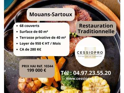 - Snack à Mouans-Sartoux Opportunité rare sur une commune dynamique et en plein essor : fonds de commerce clé en main, idéalement situé à Mouans-Sartoux, village attractif de la Côte d'Azur. Ce restaurant polyvalent, reconnu pour la qualité de son offre, propose une cuisine variée incluant pizzas, burgers, salades, et plats du jour. Points forts de l'établissement : Capacité d'accueil : Une salle intérieure chaleureuse de 32 couverts, propice à une ambiance conviviale. Une terrasse privative et intimiste de 36 places, idéale pour les déjeuners et dîners en extérieur. Services diversifiés : Restauration sur place, à emporter, et en livraison, répondant aux attentes d'une clientèle variée. Situation stratégique : Implantation dans un secteur à forte fréquentation, à proximité de nombreux stationnements. Performances économiques Chiffre d'affaires annuel : Plus de 280 000 € HT, témoignant d'un flux constant de clients. Loyer annuel attractif : 11 522 €, soit seulement 960,16 € charges comprises par mois. Informations financières Prix de vente net vendeur : 182 568.80 €. Prix honoraires inclus : 199 000 €, honoraires du cabinet compris. Cet établissement, alliant polyvalence des services et excellent potentiel de rentabilité, représente une opportunité idéale pour un restaurateur souhaitant s'implanter durablement dans une région en plein essor économique et touristique. Ne laissez pas passer cette opportunité unique ! Contactez-nous dès aujourd'hui pour plus d'informations ou pour organiser une visite.