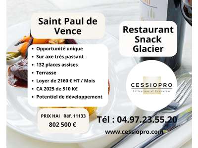 RESTAURANT SNACK GLACIER 100M² SAINT PAUL DE VENCE   Opportunité Unique : Fonds de Commerce Restaurant Snack Glacier à Saint-Paul-de-Vence Vous recherchez une affaire à fort potentiel dans l'un des villages les plus prisés de la Côte d'Azur ? Ne cherchez plus ! Nous vous proposons à la vente un magnifique fonds de commerce de restaurant snack glacier de 100 m² idéalement situé à Saint-Paul-de-Vence.   Un Emplacement Stratégique et Rare Idéalement placé sur un axe très passant, ce fonds de commerce bénéficie d'une visibilité exceptionnelle. Sa proximité avec des parkings, rares pour ce village, est un atout majeur, garantissant un flux constant de clients et facilitant l'accès pour tous.   Des Caractéristiques Complètes pour une Exploitation Optimale Le local commercial de 150 m² comprend une salle de restaurant chaleureuse, une terrasse couverte offrant une vue imprenable sur les remparts de Saint-Paul-de-Vence et la baie de Marine baie des anges et cap d'Antibes, un bar fonctionnel, une cuisine entièrement équipée. En sous-sol, vous disposez d'un espace de 50 m², idéal pour le stockage ou d'autres aménagements. L'affaire est en angle, offrant un linéaire de vitrine de 20 mètres pour une visibilité maximale.   Le loyer est de seulement 2 160 €/mois.   Un Potentiel de Développement Exceptionnel Avec un chiffre d'affaires moyen de 550 000 €, cette affaire est déjà solide, mais son potentiel de développement est immense ! L'emplacement stratégique, la grande capacité d'accueil et les facilités de stationnement offrent des perspectives de croissance considérables. Vous pourrez notamment développer les plages horaires d'exploitation pour maximiser vos revenus (l'établissement a 110 jours de fermeture). Imaginez les opportunités offertes par un service continu du petit-déjeuner au dîner, ou l'organisation d'événements privés. 750 000 € Net vendeur 802 500 € HONORAIRES DU INCLUS HONORAIRES A CHARGE DE L'ACQUEREUR DE 7,00% TTC soit 5,83% HT